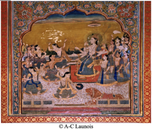 Dans le Shish Mahal du Qilā Andarūn se trouve une peinture murale de la déesse Durgā à six bras, reconnaissable à sa monture, le tigre, et à ses attributs, le trident, le disque solaire, l’arc, la conque et le croc à éléphant (illustration 1)[44]. La Déesse tient aussi un collier de fleurs et un petit objet doré non identifié, proche de son visage. Telle une reine auréolée appartenant à la sphère divine, elle trône, impassible. Avec treize compagnes et musiciennes, elle assiste aux danses guerrières, effrénées et tournoyantes, de quatre suivantes, dont l’une au premier plan porte un sabre et un bouclier rond. Cette grande composition joue habilement sur des lignes de force et des points statiques ou dynamiques. Dans ce second quart du xixe siècle, l’ensemble rappelle l’esthétique des peintures dites pahari, c’est-à-dire « des collines », en référence à la localisation des écoles d’où elles proviennent, notamment pour cette peinture murale, dans les villes de Guler et Kangrā[45]. Cette peinture murale illustre la porosité des frontières entre le sikhisme, dont l’identité récente se construit à la fin du xviième, aux xviiie et xixe siècles, et l’hindouisme millénaire, dans un Panjab peu à peu dominé militairement et politiquement par la petite minorité des Sikhs avant la colonisation britannique[46].