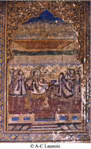 Au deuxième étage du Qilā Andarūn, une chambre particulière dite Shish Mahal des reines avance sur les terrasses (plan 1). Elle tient son nom de deux petites pièces latérales décorées de miroirs aux formes géométriques sobres, incrustés dans une résille de plâtre doré sculpté, et d’une salle centrale, plus ouverte et plus grande, complètement peinte, durant le second quart du xixe siècle, de quarante-huit panneaux thématiques (plan 2). Ces peintures sont l’œuvre d’une équipe d’artisans, le maître se chargeant des sujets majeurs et ses meilleurs élèves peignant les personnages annexes, tandis que les apprentis s’attachaient aux paysages souvent plus schématiques[54].