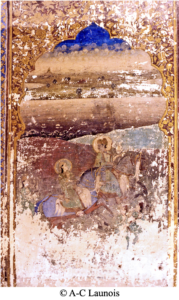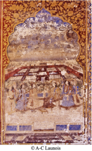 Sur la gauche du mur nord-ouest du Shish Mahal des reines (plan 2), une peinture murale couverte d’une couche de vernis représente une reine auréolée siégeant en majesté sur un imposant trône doré porté par quatre lions assis[57]. Cette reine reçoit en audience publique une élégante princesse suivie d’un groupe de femmes (illustration 2). Derrière la reine, une suivante un peu plus grande, au visage sévère, peut-être plus âgée, évoque la surintendante du zanānā : la sadr-i anāsà l’époque moghole, ou la barāne dans un contexte rājput du xixe siècle[58]. Toutes ces dames sont vêtues, selon la mode de l’Inde du Nord, d’une longue robe (peshvāz) par-dessus un pantalon serré aux chevilles (īdār pājāmā) et couvrent leur chevelure d’un long voile (dupattā), parfois transparent.