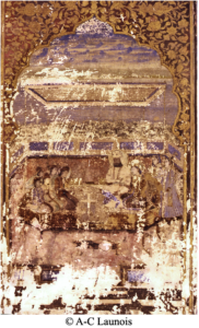Pourtant, ce Shish Mahal des reines n’est pas situé dans le zanānā évoqué plus haut. Il est directement à sa gauche, séparé de lui par une paroi. Un cheminement indirect à travers diverses salles permet de rejoindre ce zanānā. La position particulière de cette chambre des reines permet d’observer, au rez-de-chaussée, la cour du Shish Mahal, où s’ouvre une grande salle d’audience du mardāna[56]. De là, le roi pouvait par un large escalier latéral, fermé aux extrémités par des portes en bois, rejoindre le Shish Mahal des reines sans passer par la porte d’entrée du zanānā. Cette chambre unique en son genre aurait pu être à la fois un lieu d’observation des allées et venues dans le cœur du mardāna et un lieu de retrouvailles pour les couples royaux.