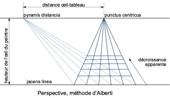 Ce texte fait référence au dispositif théorisé par Alberti en 1435[14]. Pour produire l’illusion d’une représentation objective, il faut en effet que le spectateur, comme dans le dispositif originel inventé par Brunelleschi, adopte la position d’un œil unique situé à un point précis, le « point assigné par la perspective et commandé par la localisation du point principal sur le tableau »[15]. Autrement dit, la représentation suppose une mesure fondée sur la convergence des lignes parallèles vers un point de fuite : point idéal et déterminé géométriquement, assigné comme lieu d’objectivation.