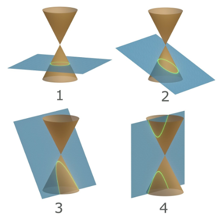 Fig. 5 : Les différentes sections coniques : 1. cercle, 2. ellipse, 3. parabole, 4. hyperbole. CC BY-SA 4.0, Wikimedia Commons.