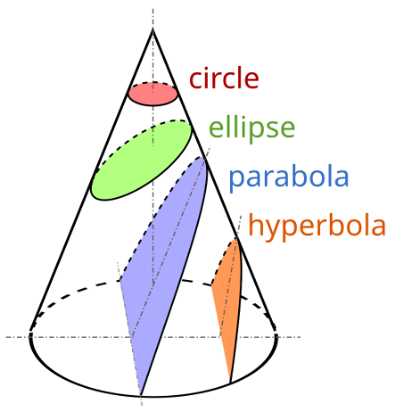Fig. 6 : Sections coniques représentées à partir d’un cône d’Apollonius. CC BY-SA 3.0, Wikimedia Commons.