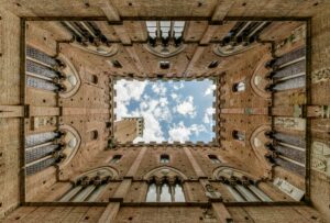 Fig. 1 : la perspective linéaire, dite « albertienne », à point de fuite central. CC BY-SA 3.0, Wikimedia Commons.